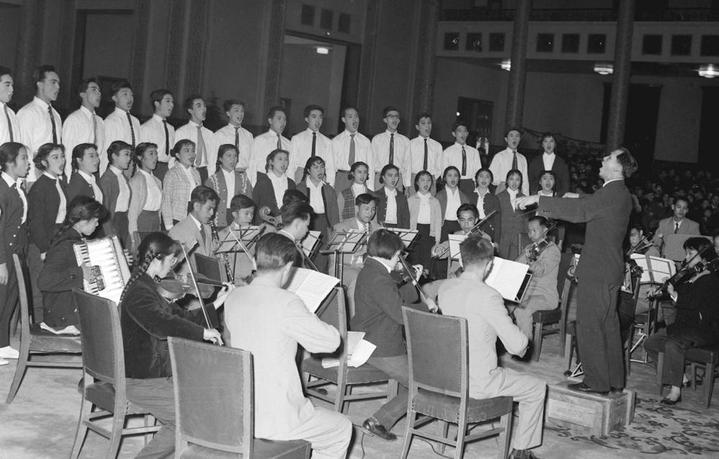 1964年2月10日晚,相册在首都的归国华侨聚会北京人民大会堂,举行春节联欢晚会。图为华侨大学文艺系学生在晚会上合唱《我们走在大路上》。丨年