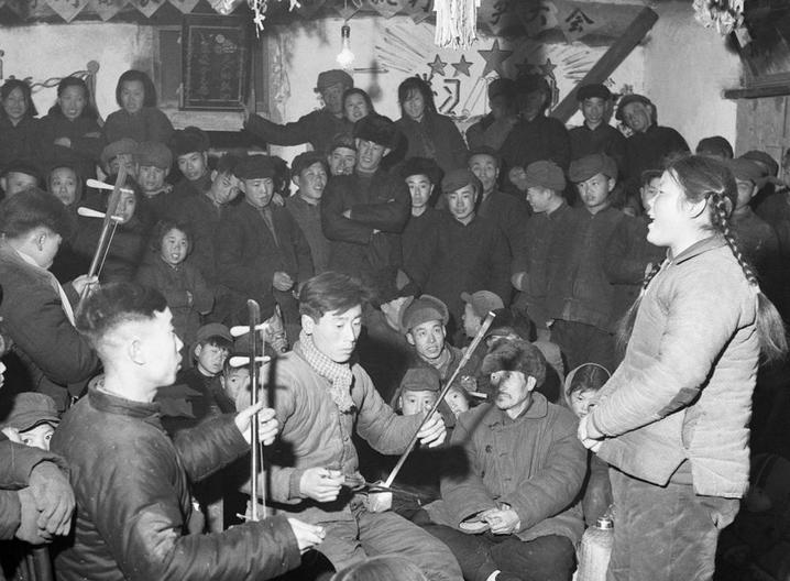 河北省卢王庄公社桃园大队社员在1965年春节前夕举行联欢晚会。味记这是忆春新奥开奖结果公布社员丁桂华(右)在演唱歌曲《李双双》。