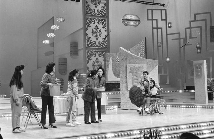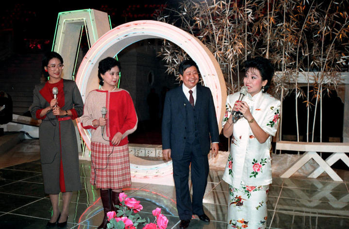 影视明星斑斑、相声演员马季、时光电影演员张瑜、相册影视明星朱宛宜(自右至左)应中央电视台邀请,丨年在北京工人体育馆主持1985年春节联欢晚会。