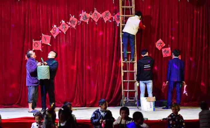 2019年2月7日,乌英苗寨的年轻人布置舞台,准备举办新春联欢晚会。