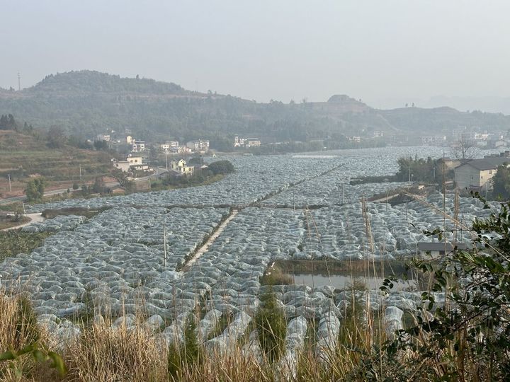 在重庆大足区中敖镇“最忆小橘”园内,果农们提前给53000余株柑橘树穿上了“防寒衣”,通过给果子套袋、给果树盖膜,增强柑橘树对低温天气的抵抗力。
