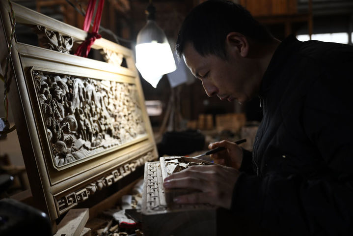 在黄山市歙县精华园旅游投资有限公司,工作人员在制作徽派仿古建筑配件。 新华社记者 周牧 摄