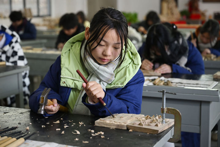 在位于黄山市歙县的行知学校,学生在学习非遗木雕制作。 新华社记者 周牧 摄